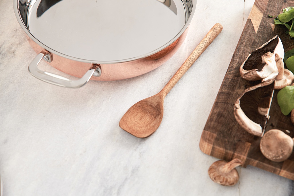 Эксклюзивная трехслойная медная сковорода с крышкой. Первый слой — это медная внешняя часть, а внутренняя часть состоит из слоя алюминия и слоя нержавеющей стали, что облегчает очистку. Слои меди и алюминия хорошо проводят тепло, позволяя сковороде быстро и равномерно нагреваться. Дно усилено более толстой пластиной из нержавеющей стали, что позволяет использовать ее на индукционной плите. Сковорода имеет ручку из нержавеющей стали, которая остается холодной во время приготовления пищи. Подходит для всех типов плит.