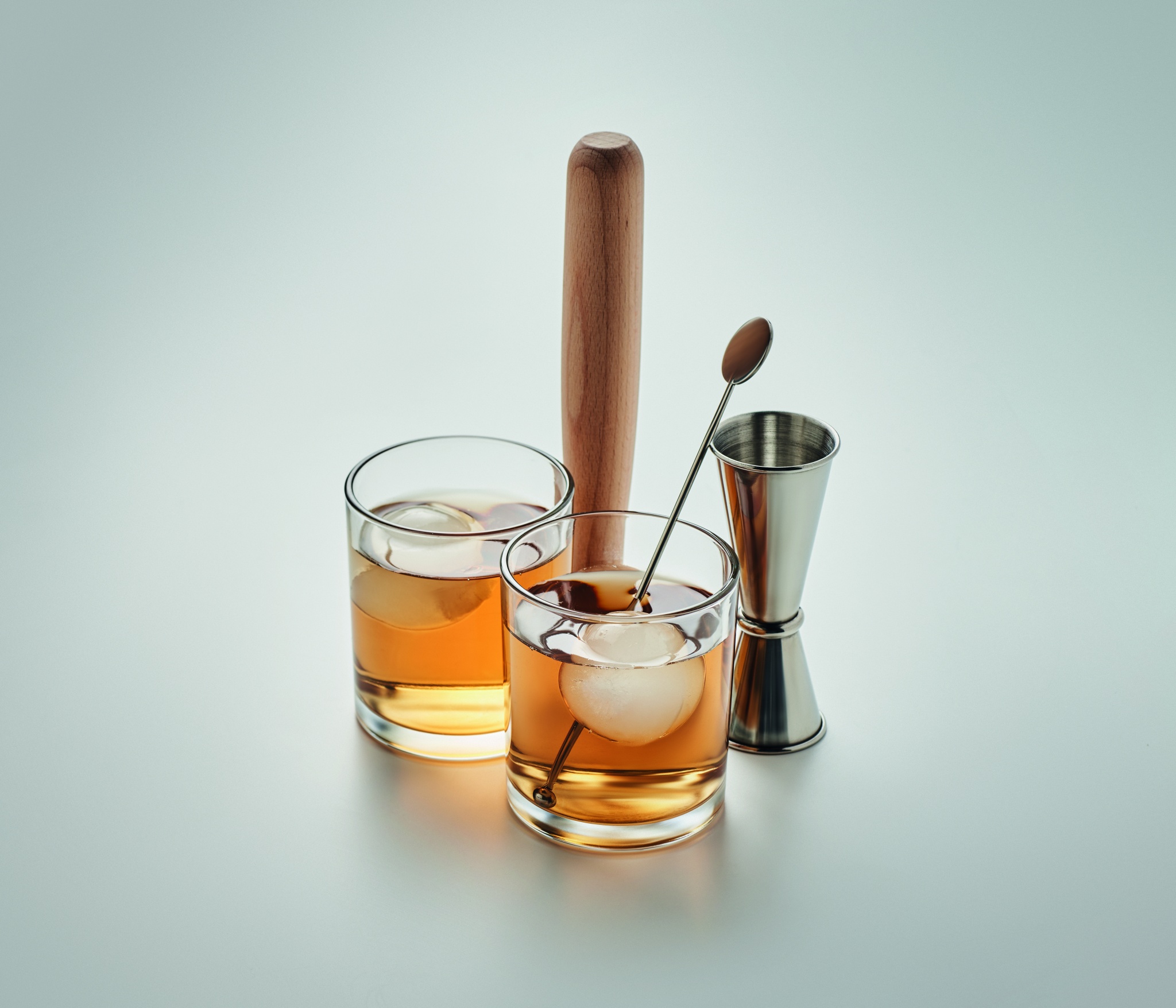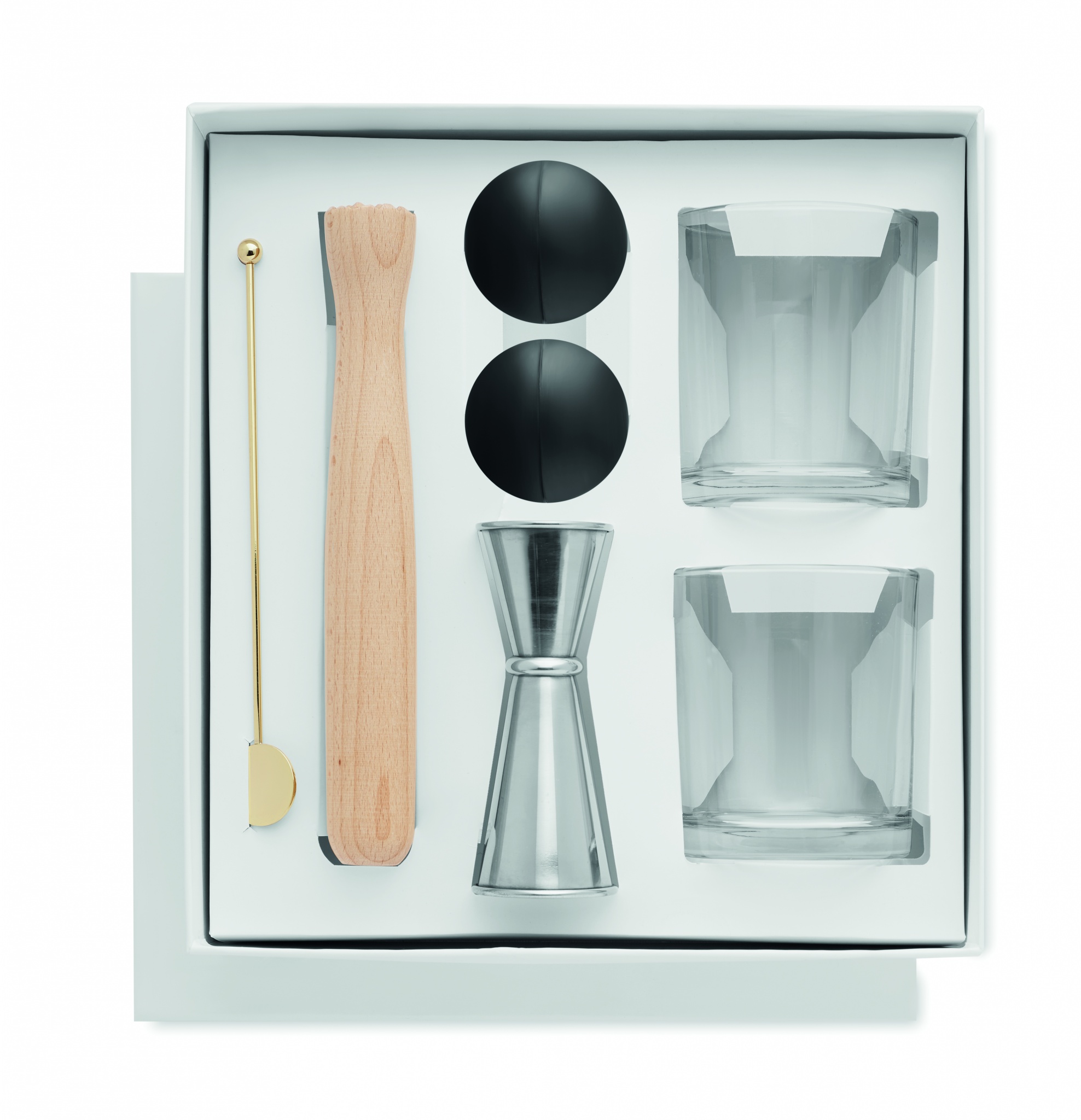 Набор бокалов для коктейля. Включает 7 предметов: два стакана, двусторонний мерный стаканчик из нержавеющей стали (25 и 50 мл), деревянная толкушка, размешиватель для напитков из нержавеющей стали и две силиконовые формы для льда в виде сферы.