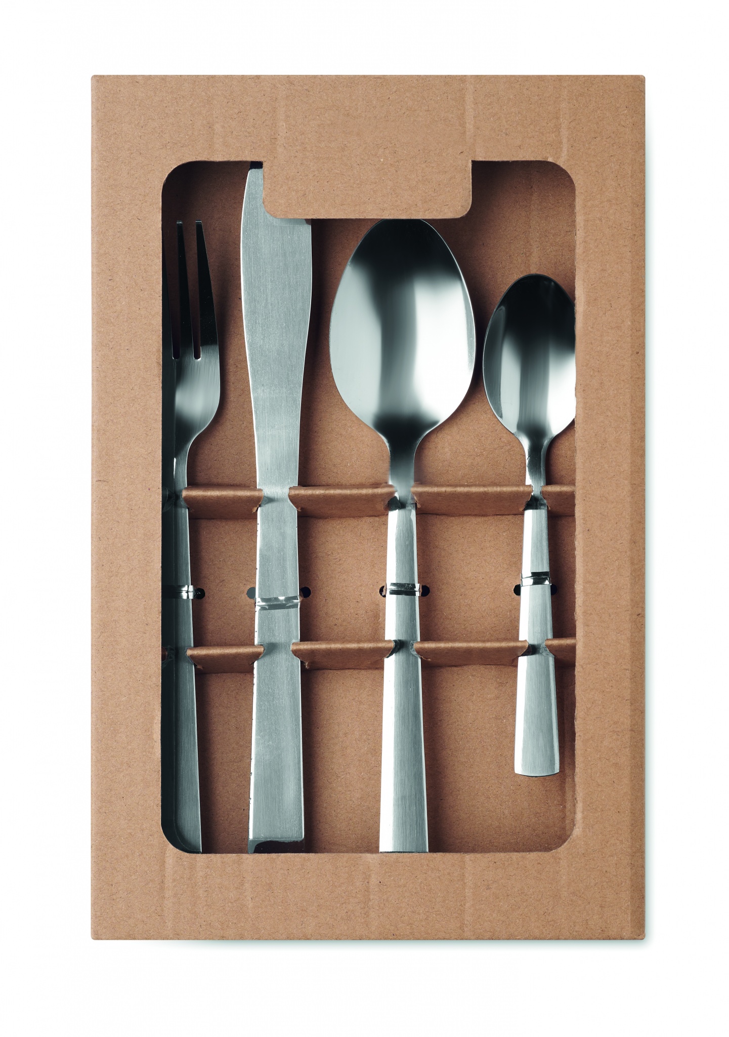 Набор столовых приборов из нержавеющей стали на 4 персоны, 16 предметов. В набор входят: чайная ложка, столовая ложка, вилка, нож. Поставляется в коробке из крафт-бумаги. Нанесение только на коробке.