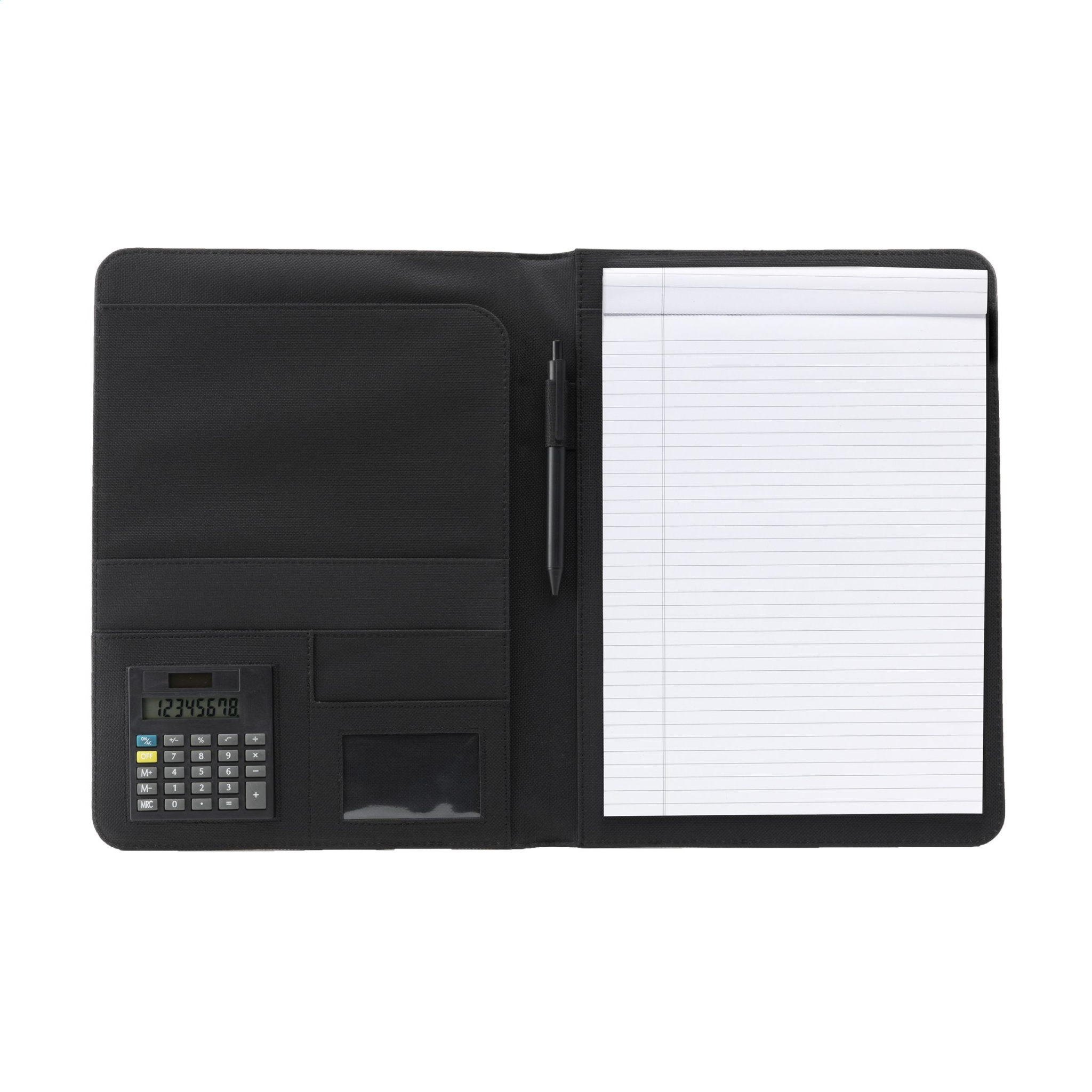 Папка для конференций/документов из полиэстера 600D/искусственной кожи формата А4. Включает съемный калькулятор с двойным питанием (включая батарею), блокнот и шариковую ручку.