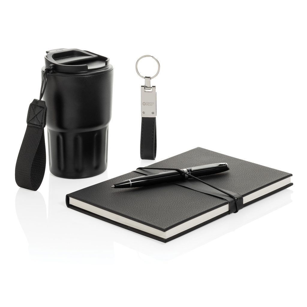 Этот роскошный подарочный набор включает в себя все необходимое, чтобы стильно провести рабочий день. Стакан объемом 350 мл с двойными стенками и вакуумной изоляцией сохраняет напиток горячим или холодным в течение длительного времени. Герметичная крышка гарантирует, что ваша одежда останется сухой, даже если стакан случайно наклонится или будет стоять не вертикально. Чтобы ваши самые важные ключи всегда были под рукой, в набор входит премиальный брелок Swiss Peak с глянцевой металлической отделкой и красивым ремешком из искусственной кожи. Нужно записать мысли или идеи? В этот набор также входит элегантная деловая шариковая ручка с запасом чернил 1000 метров и мягкий на ощупь блокнот из переработанного полиэстера. Блокнот содержит 160 страниц кремового цвета из переработанной бумаги. Все предметы в этом подарочном наборе сертифицированы RCS, что гарантирует полностью проверенную цепочку поставок используемых переработанных материалов. В общей сложности, продукты в этом наборе на 75% состоят из переработанных материалов.
