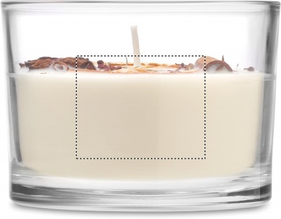 Восковая свеча с ароматом корицы и цитрусовых на растительной основе с засушенными цветами и фруктами в стеклянном стаканчике. 300 гр. Время горения: 50 часов.