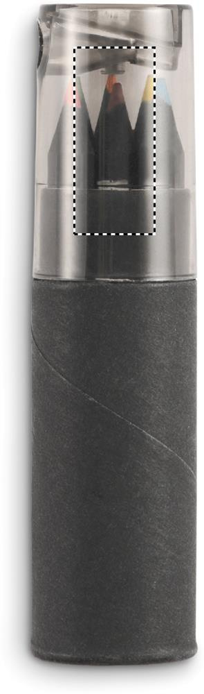 Svartfärgad papperbehållare som innehåller 6 färgpennor och en pennvässare i locket på lådan.