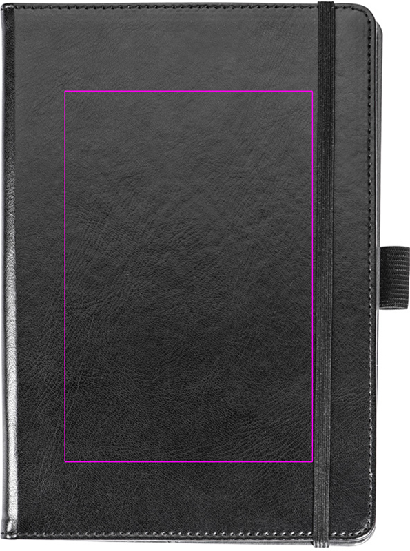 A5-anteckningsbok i läderimitation, med 80 raderade sidor, 4 infällbara fack och pennögla. Vi trycker din logotyp på omslaget.