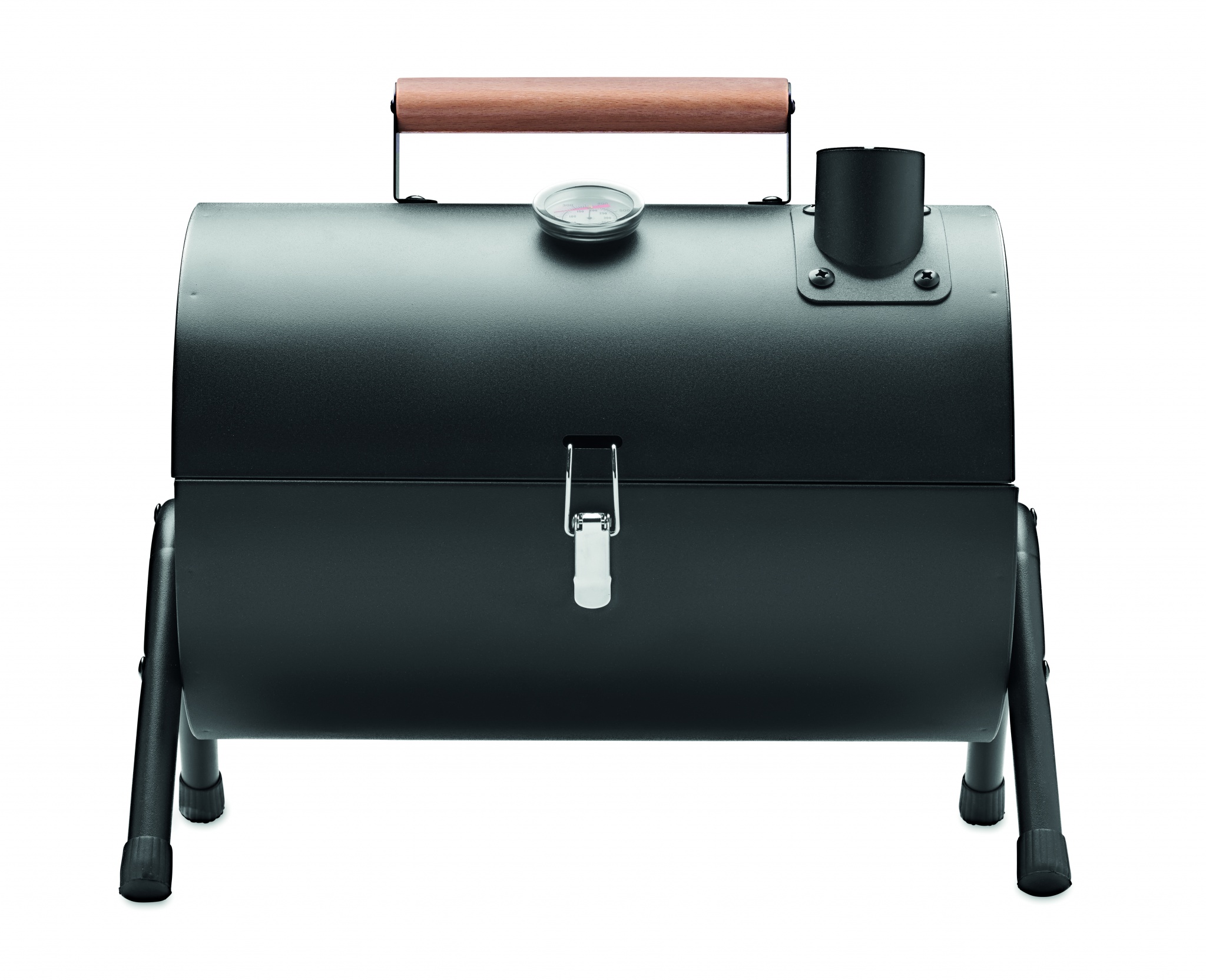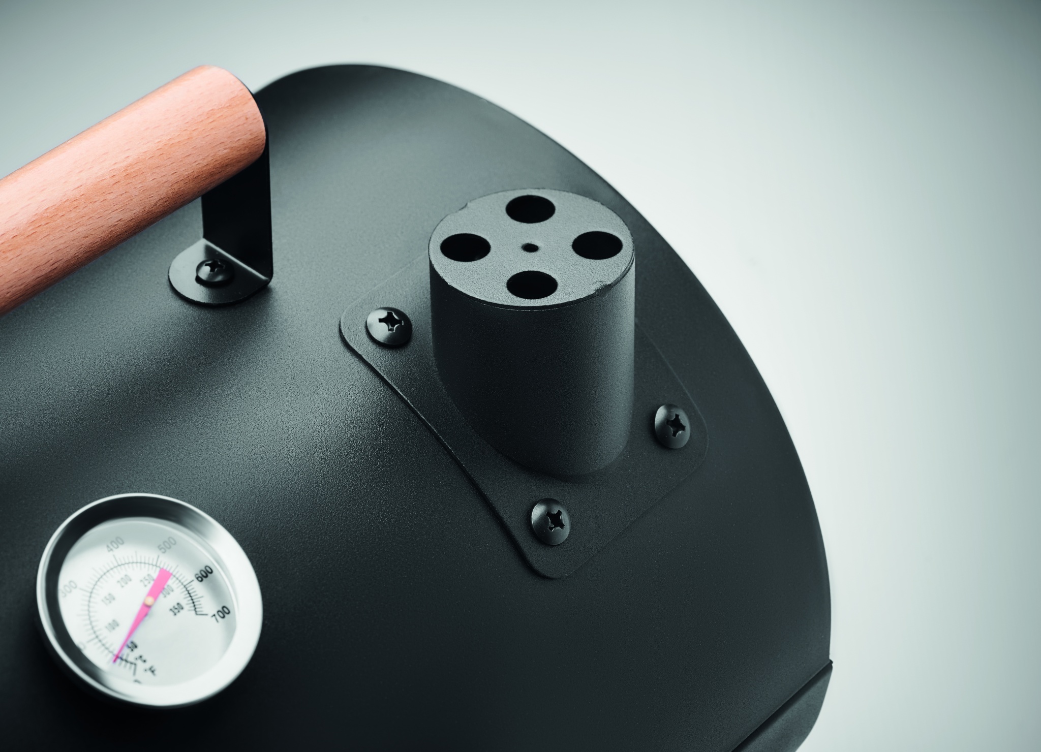 Bärbar grilltunna i järn med skorsten och temperaturmätare. Svart pulverlackerad eldstad. Låsspärr och bärhandtag i trä.