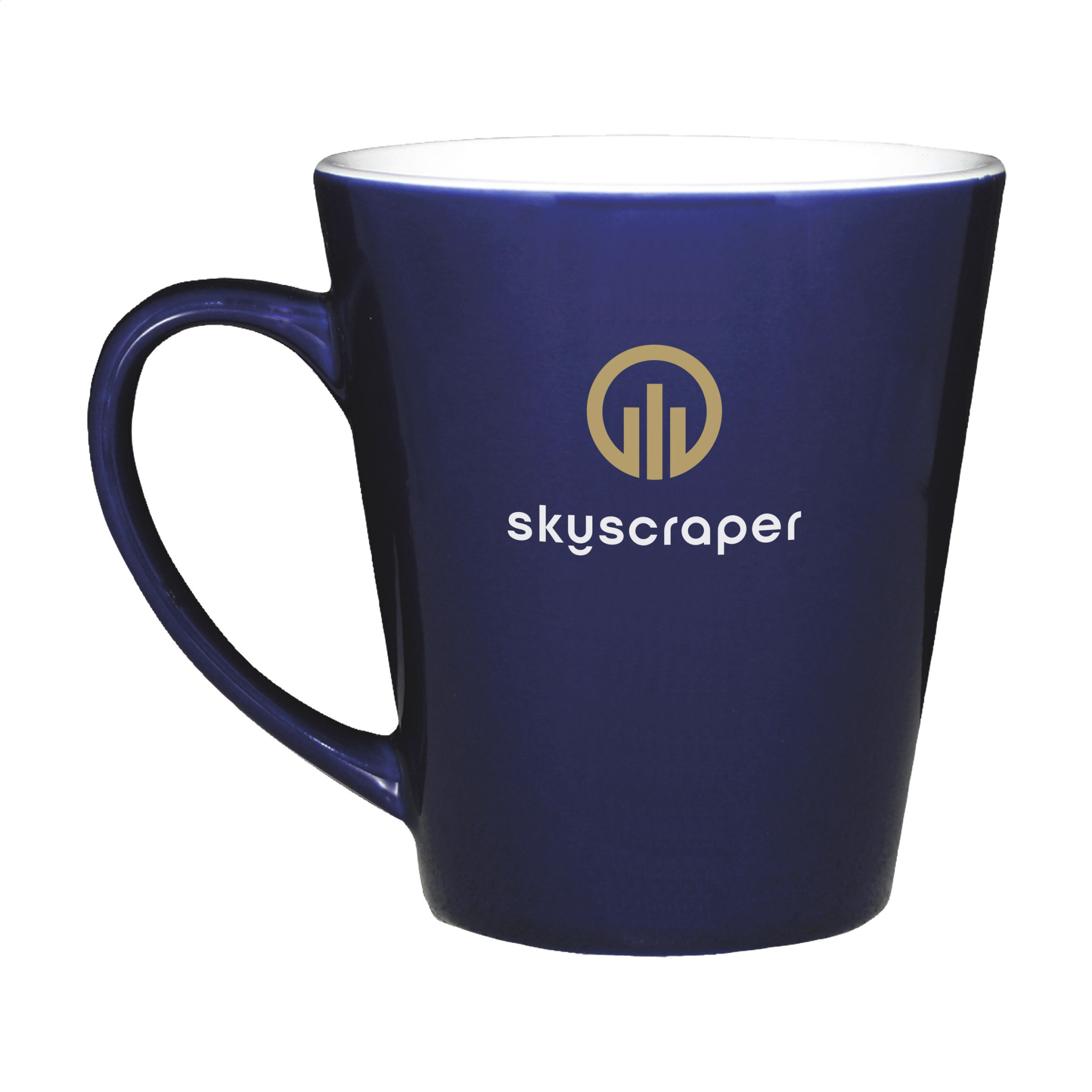 Modern kvalitets keramisk mugg. Helvit eller med färgad exteriör. Tål diskmaskin. Kapacitet 310 ml. Trycket är diskmaskinstestat och certifierat: EN 12875-2.
