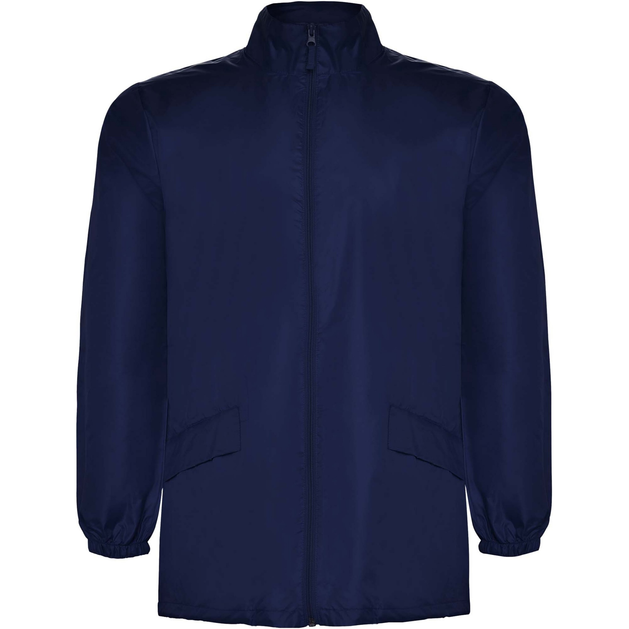 Vattentät regnjacka. Hög krage och vikbar huva med justerbar dragsnodd. Dragkedja framtill med matchande löpare. Två sidfickor med lock. Elastiska muddar. Elastiskt snöre inuti fickan för vikning och förvaring. Vattentät modell. Modellen är 185 cm och bär storlek L.