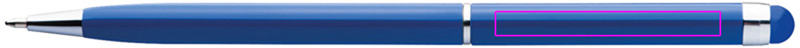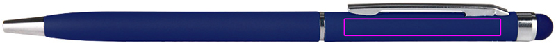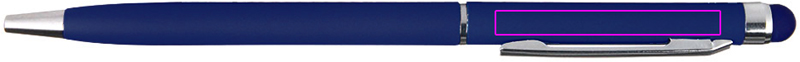 Kulpenna i rostfritt stål med blåskrivande plastpåfyllning och färgmatchad touchfunktion ovanför klämman. Vi kommer att gravera din logotyp under klippet.