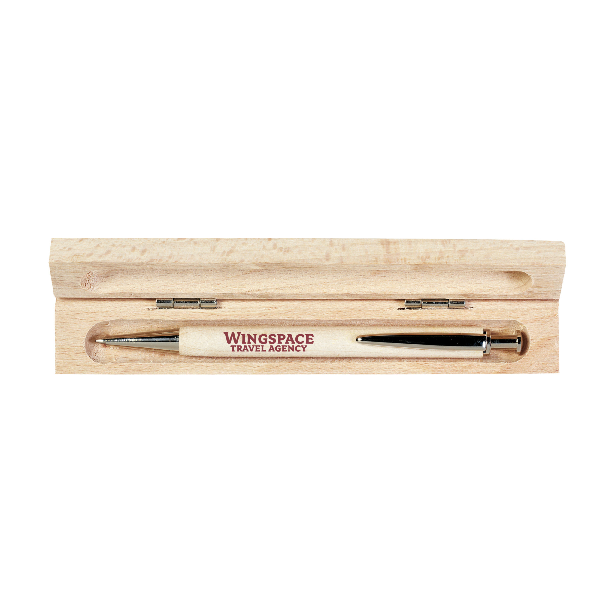 WoW! Blått bläck, kulspetspenna i bokträ med kromklämma, tryckknapp och spets. I bokträskåp.