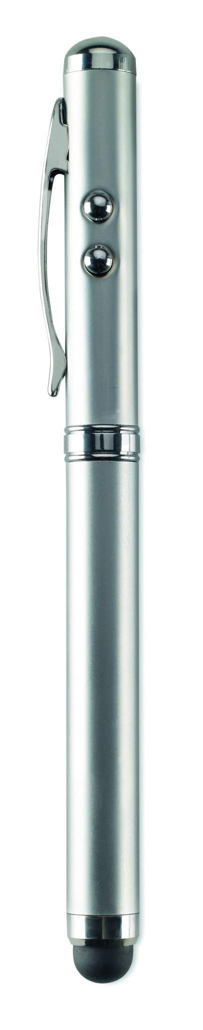 Multifunktionell kulspetspenna i silver metall. Blått bläck refill, vitt LED ljus, röd laserpekare, touch tip för touchscreens. ABS och svart gummigrepp. Blått bläck refill, LED vitt ljus och röd laserpekare. Inkl. 3 knappcellsbatterier. Metall box.