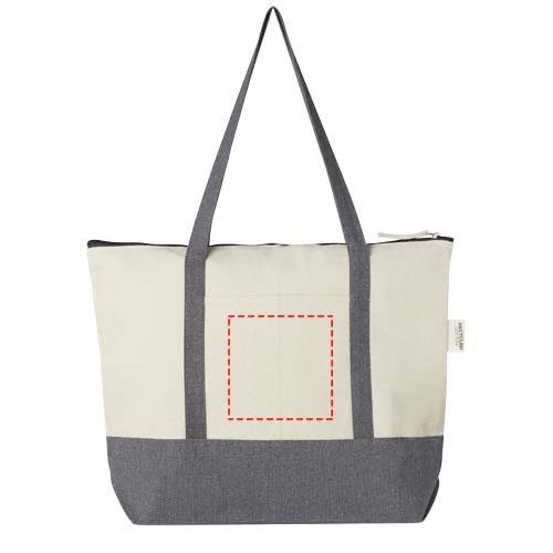 Repose tygväska av 320 g/m² återvunnen bomull med dragkedja är tillverkad av miljövänlig, återvunnen bomull från konsumentavfall. Den har ett huvudfack med blixtlås, trendiga färgblock, en sned ficka på framsidan och handtag på 27 cm. Bärkraft upp till 10 kg.