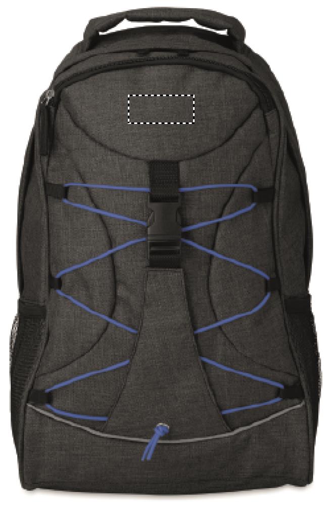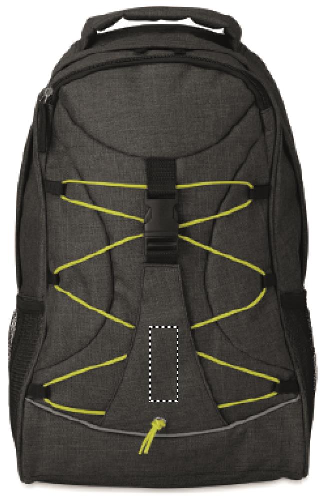 Ryggsäck i melerat 600D polyester med färgglada kontraster och reflexband. Meshficka på båda sidor och spännband på fronten för praktisk förvaring.