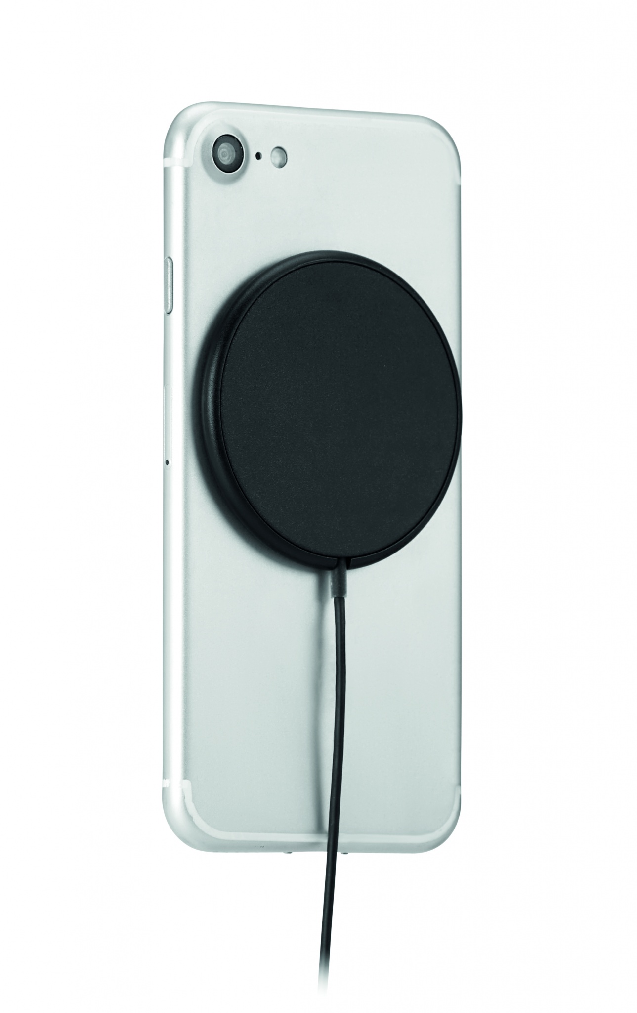 Magnetisk trådlös laddare i ABS. Ladda din smartphone trådlöst med denna laddningsplatta. Eftersom den har en magnet inuti kommer att fästa mot din telefon, även när du använder din telefon. Bra när du vill ladda din mobila enhet, men också vill ringa eller titta på en video. Denna laddare innehåller en extra magnetisk metallring för att stödja laddning av icke-magnetiska trådlösa laddningsbara telefoner. Kompatibel med iPhone® 12 och nyare. Utgång: DC 9V / 1.1A (10W) för snabb laddning.