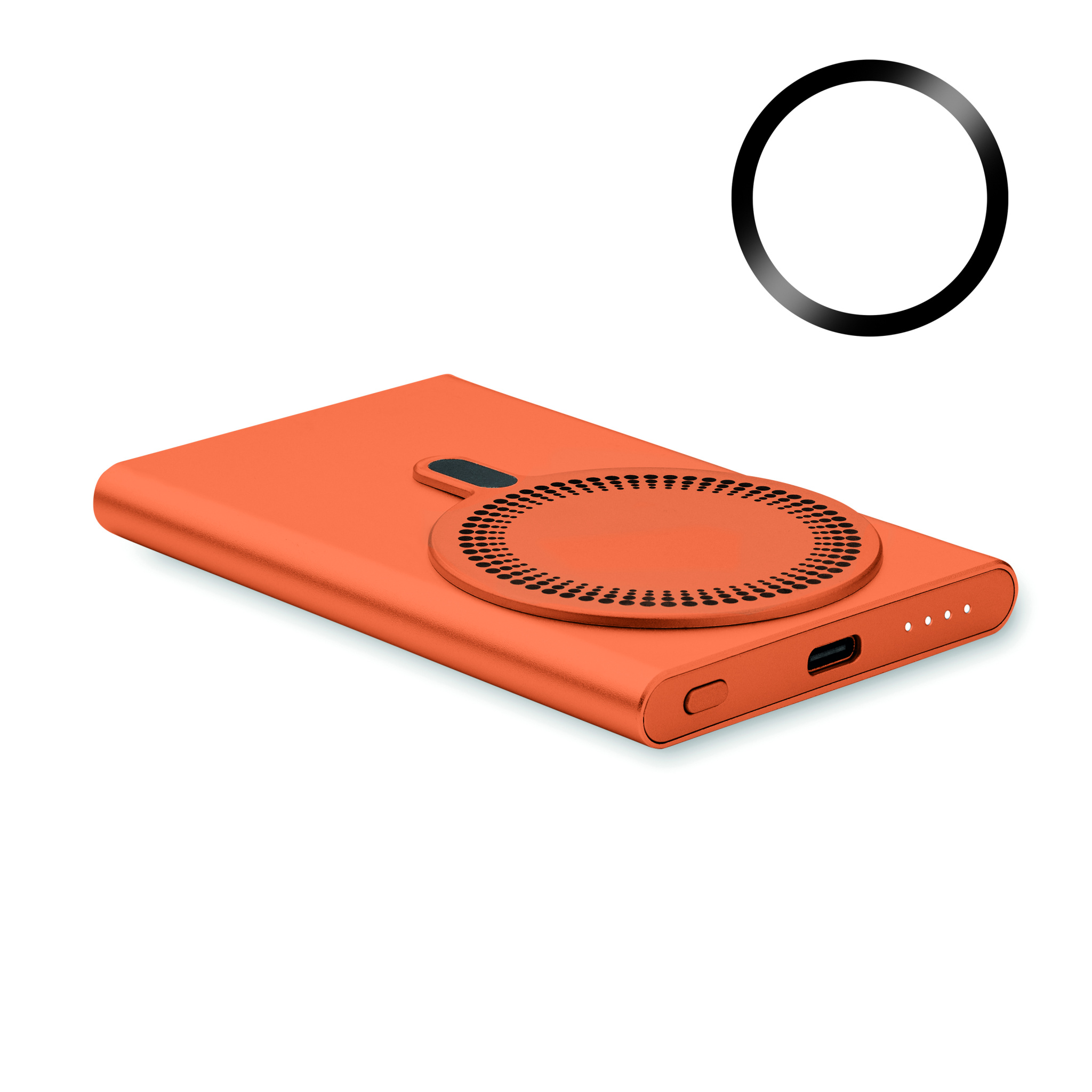 Magnetisk powerbank 5000mAh med trådlös laddning 15W, via kabel 20W, i återvunnen aluminium. Utgång: DC 9V/1,66A. In/utgång: Typ-C. Stöd för Power Delivery (PD) för laddning av den senaste bärbara datorn MacPro®. Ingång/utgång: Typ-C. Levereras med extra metallring för icke magnetsika telefoner